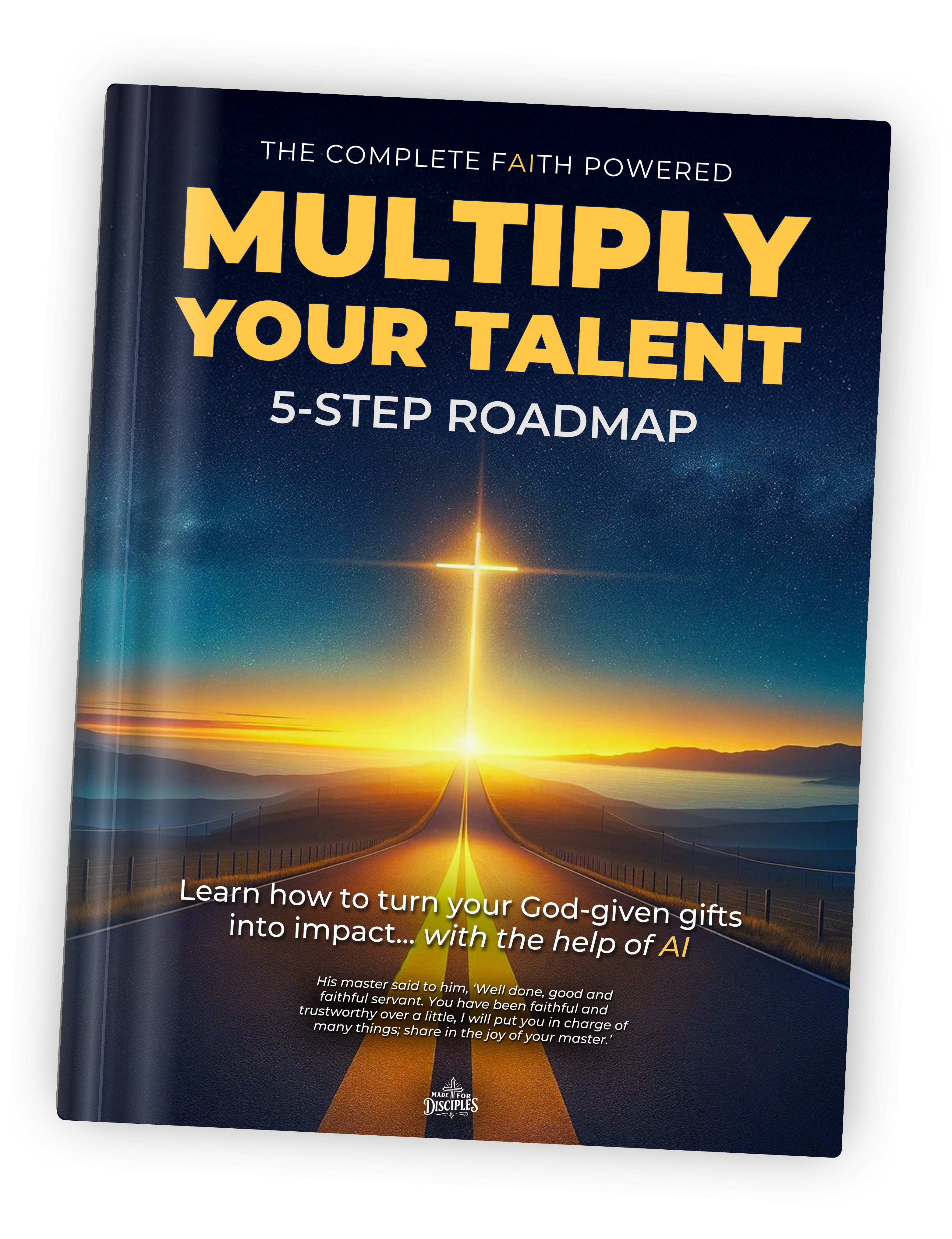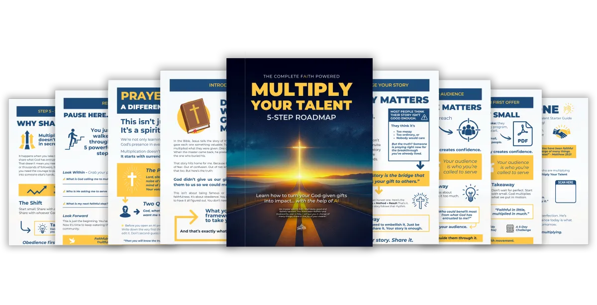 That’s why I created the Multiply Your Talent 5-Step Roadmap (AI Edition). It’s a simple, step-by-step workbook designed to help faith-driven entrepreneurs uncover their God-given gifts, hear His direction clearly, and take the first faithful steps to multiply what He’s entrusted to them.